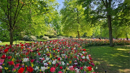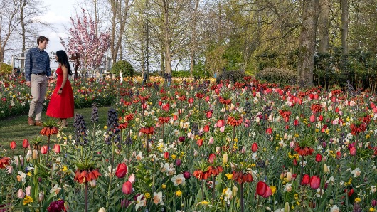 Spring reaches its colourful crescendo at Keukenhof with a striking floral display by JUB Holland: a bold bulb planting designed as a colourful still life.