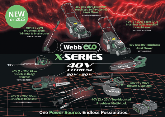 Webb, trusted by British gardeners for generations, has unveiled its new Eco X-Series 40V cordless range – combining Webb’s heritage with the fast-growing appeal of battery powered garden machinery.