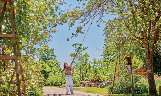 Thanks to the newly developed adapter, the StarCut Pro can be combined with attachments from the GARDENA combisystem such as the fruit picker, berry picker, gutter cleaner and the 300 PP gardeners’ saw. The StarCut Pro saw is part of the StarCut Pro set, but can also be used as a single saw.