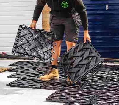EASYClickBase replaces the traditional full mortar laying bed, reducing the need for sand and cement in that phase of installation. Thin surface dressings, such as porcelain tiles, can be glued directly to the sub-base, while block paving can be laid on a thin layer of bedding sand. Made from 100% recycled plastic, EASYClickBase has the potential to significantly reduce the environmental impact of landscaping projects.