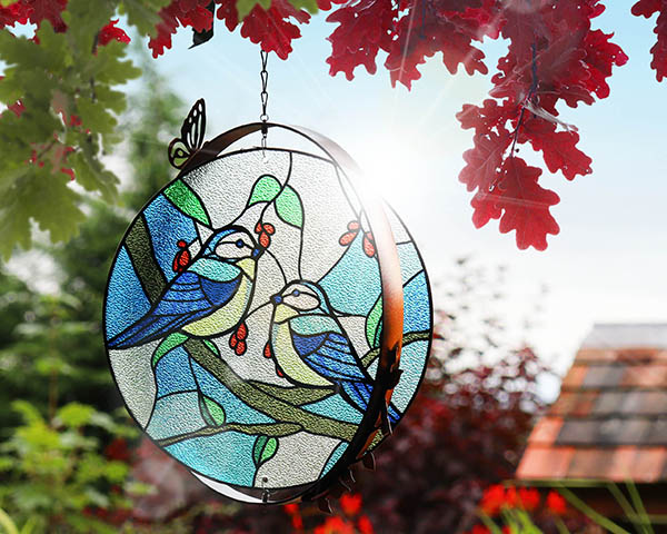 Likewise, the hand-painted hanging glass suncatchers capture the sunlight at every turn bringing to life the central panels bearing either a Peacock, Blue Tit, Kingfisher or Butterfly.