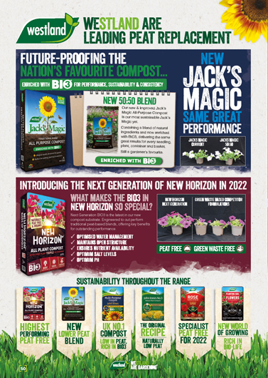 After five years of R&D Westland is reformulating Jack's Magic Compost to contain 50% BIO3, it’s peat-replacement technology that matches the performance of peat. New Horizon Peat Free Compost continues to deliver outstanding results in independent NIAB* trials, from rooting and establishment to flowering and uniformity.