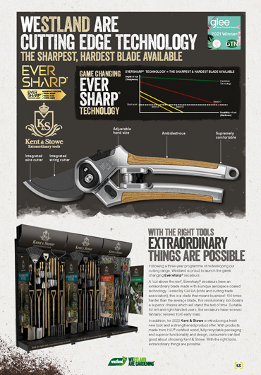 Kent & Stowe Eversharp secateurs are UK designed and are independently proven to be twice as sharp and last five times longer than the market leader. The extraordinary blade is made with a unique coated metal based on Formula One and aerospace technology.