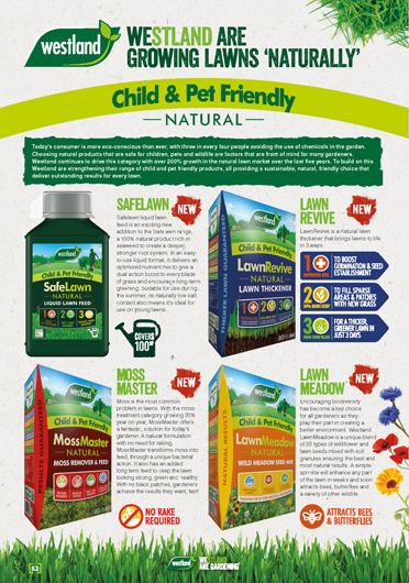 Westland extends its child & pet friendly natural lawn range with Lawn Revive Natural Lawn Thickener, adding seeds it greens and enriches the soil for long lasting great lawns. Safelawn Liquid Feed has an optimum nutrient mix and easy-to-use liquid format for long term greening. MossMaster offers a bacterial non-pesticide solution for moss, with no need for raking and Lawn Meadow is a unique blend of 20 types of wildflower, lawn seeds and soil granules ensuring the most reliable results for a wildlife bio garden.