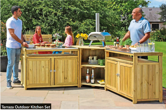New and on trend for outdoor entertaining, the Terraza Outdoor Kitchen Set provides a sustainable route to alfresco cooking. The set comprises two double units, with stainless steel counter tops, and a display corner unit. An optional side table is available.