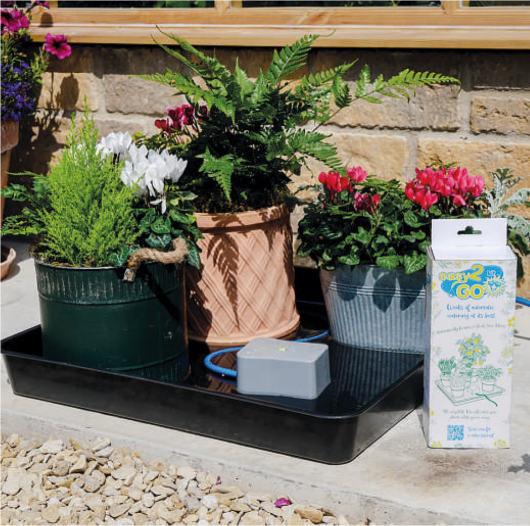 easy2GO perfectly preserves potted plants for growers whilst they’re away. All they need do is gather their potted plants together on a garden tray. Place easy2GO onto the tray and connect it to a water supply. Switch on the supply and you’re away!