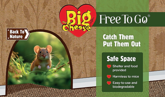 The Big Cheese Free To Go is a completely new way to control rodents without harming them. It’s a safe space for mice with meals included – making it easy to simply Catch Them & Put Them Out!