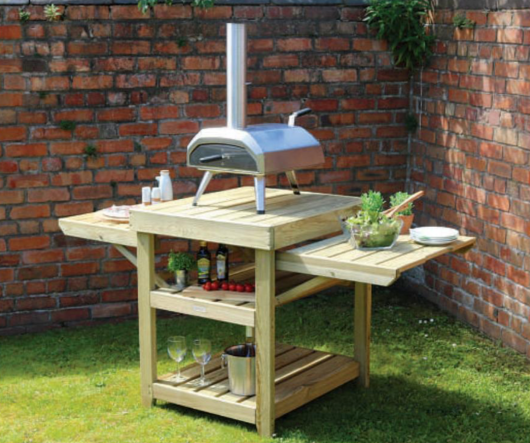 Designed with outdoor cooking in mind, the table provides 360 degree access for fuelling the oven, as well as cooking and serving pizzas. The main central table top is designed to securely hold a pizza oven with fold up sides for preparation and serving.