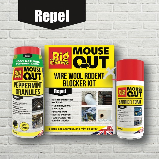 The Big Cheese Mouse Out includes wire wool and expanding foam blockers that are suitable for use indoors and out, along with powerful peppermint oil refresher sprays and granules that destroy unpleasant odours and disrupt rodent pheromone trails around the home.