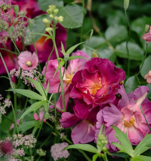 Designed for The Glasshouse, a social enterprise supporting women nearing the end of their prison sentences through horticultural training and employment, the garden features a powerful planting palette of deep magentas, rich burgundies, and soft apricot tones. Among the standout varieties is the ever-popular Rosa ‘Wild Rover’—a semi-double, dark mauve floribunda with a creamy yellow eye, known for its long flowering season and pollinator appeal. This variety has proven so popular that it is currently sold out.