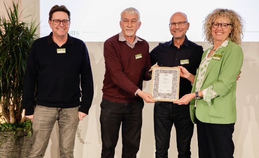 Colin Dale (second from left) receives his RHS Long Service Award with (L-R) Stuart Andrews, Plant Buyer; Nick Burrows, CEO; and Caroline Notcutt, Vice Chairman, Notcutts. [Credit/Copyright: Chris Kemp]