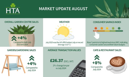 July 2025 was officially the UK’s fifth hottest July on record, with temperatures averaging 16.8°C. As the weather warmed across the country, so too did sales at UK Garden Centres. Latest data from the Horticultural Trades Association (HTA) August Market Update reveals steady growth, with overall revenue up +4% compared to July 2024 and July 2023.