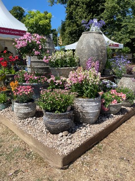 Charles Stubbs created the display with the team filling impressive pots from Woodlodge with a selection of perennials, annuals and shrubs in a mix of blue, white and pink.