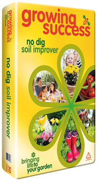 Right: The new, easy to use 50L Growing Success No Dig Soil Improver Left: The new Growing Success packs are lighter and livelier, with a yellow airbrushed background evoking sunshine.
