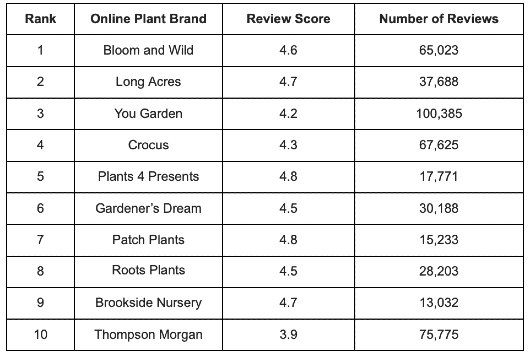The online plant industry is highly competitive; many brands record extensive online feedback. Overall, seven of the top ten brands recorded over 20,000 reviews.