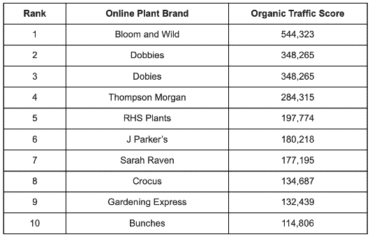 The findings crown Bloom and Wild as the online plant industry’s market leader, by some distance. With an impressive organic traffic score of 544,323, the UK retailer tops all other brands in the industry, securing its leading position for the second consecutive year.