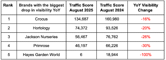 Additionally, Hortology (20%) and Jackson Nurseries (26%) experienced turbulent years, while Hayes Garden World lost 100% of its visibility, following a site migration in early 2025.