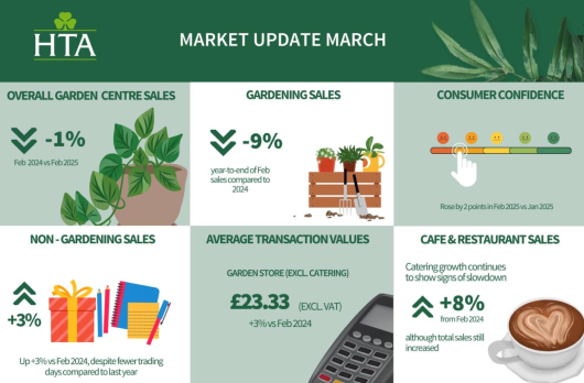 The latest HTA Market Update for February 2025 highlights a mixed performance for UK garden centres. Overall sales were down 1% compared to February 2024 but up 3% from February 2023. It's important to note that February 2024 included an extra trading day due to the leap year, which slightly affects the comparison with February 2025.