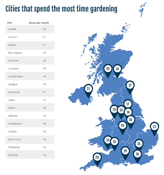 The nationwide survey of 2000 people found Cardiff is the UK's most dedicated city when it comes to gardening, with residents spending a day a month (24 hours) tending to their outdoor spaces, spending 41% more time gardening than the UK average of 17 hours. Wales was identified as the most green-fingered region, with locals spending over a full day (27 hours) gardening each month.