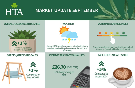 “You may have noticed that last month’s update introduced a new Consumer Spending section, providing a broader benchmark for garden centre performance against other retail sectors. Data for August indicates that consumer card spend on household retail (including gardening) was up 1.2% from August 2024, with garden centre spend specifically only rising 0.6%. However, it is important to note that these figures exclude cash transactions and therefore differ from HTA’s overall sales reporting.”