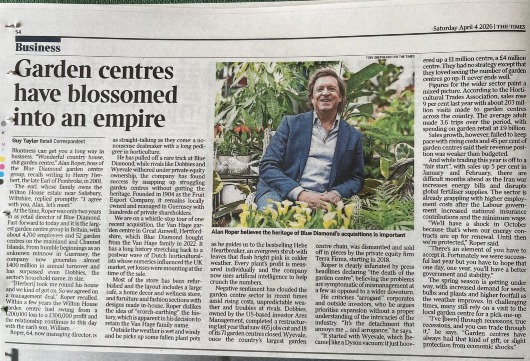 As is the tradition of our UK national press, stories about garden centres made it into their pages over Easter. Alan Roper was interviewed in the Times where he was quoted as saying "I've been through true recessions, and you can trade through it. Garden centres have always had that kind of gift, or slight protection from economic shocks."